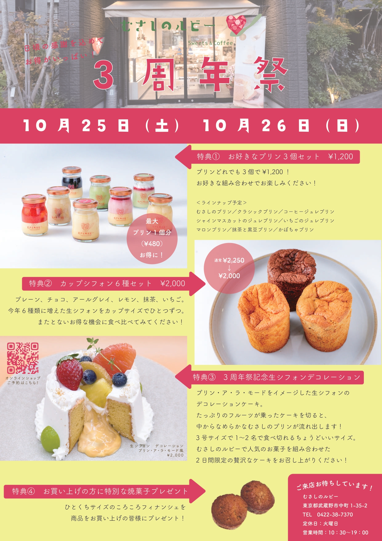 お知らせ 「3周年祭」開催します 2025年10月21日 by kanri99 いつもご利用いただきありがとうございます。 むさしのルビーは今月で3周年を迎えます。 日頃の感謝を込めて、10/25(土)・26(日)の2日間、「3周年祭」を開催します♪ この機会に是非お立ち寄り下さいませ! ※詳細情報は、随時Instagramにてお知らせいたします。